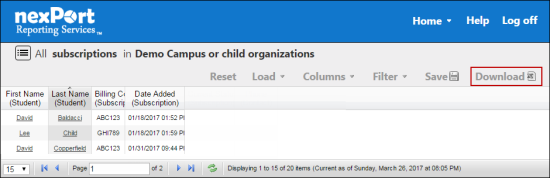 You can download the selected custom report to Comma-separated values (CSV) file format for further editing, archiving, or sending by email. CSV files contain tabular data (numbers and text) in plain-text form. A specified separator is inserted between column values and each row starts on a new line.