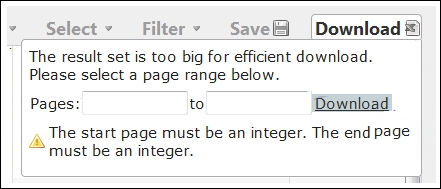 You receive the following notification, if a custom report has more than 100,000 results, "The result set is too big for efficient download. Please select a page range below." In such cases, you can type the page range for the custom report that you need to download.