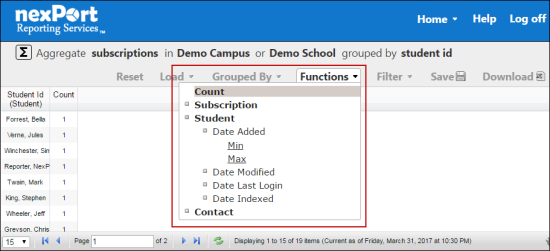 You can select functions to be performed on the grouped data within an aggregate report. These functions are displayed as columns in your aggregate report.