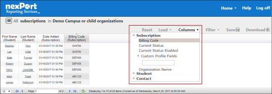 Some of the column names appear with a search box. Type the first few characters of the column fields that you need to search. NRS populates matching results, select the column fields that need to be displayed in your custom report. For example, if you need to display custom profile fields in a custom report. NRS populates matching results such as, Birthday, Id Number, and other custom profile fields.